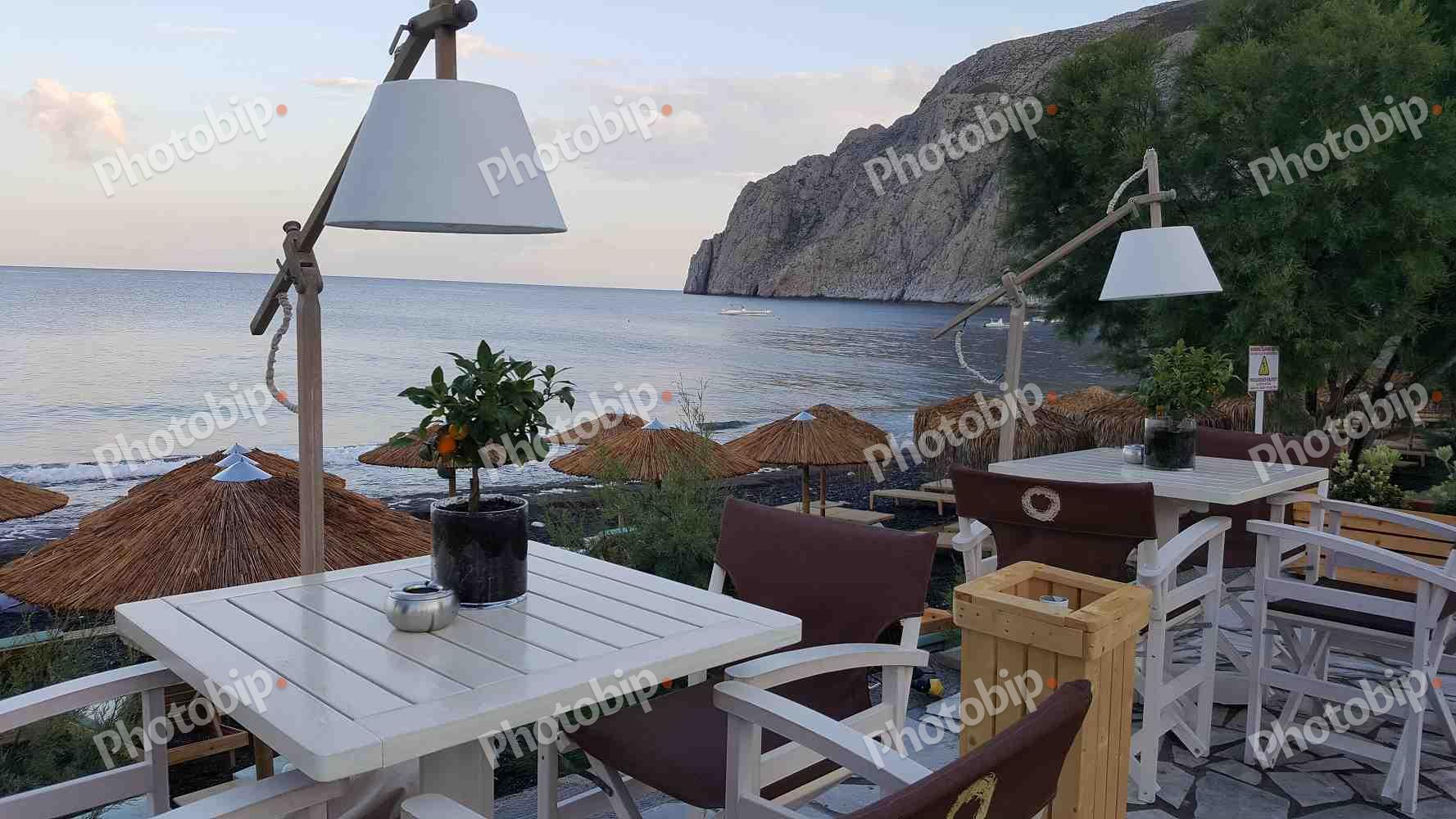 Stolovi na plaži sa suncobranima u pozadini