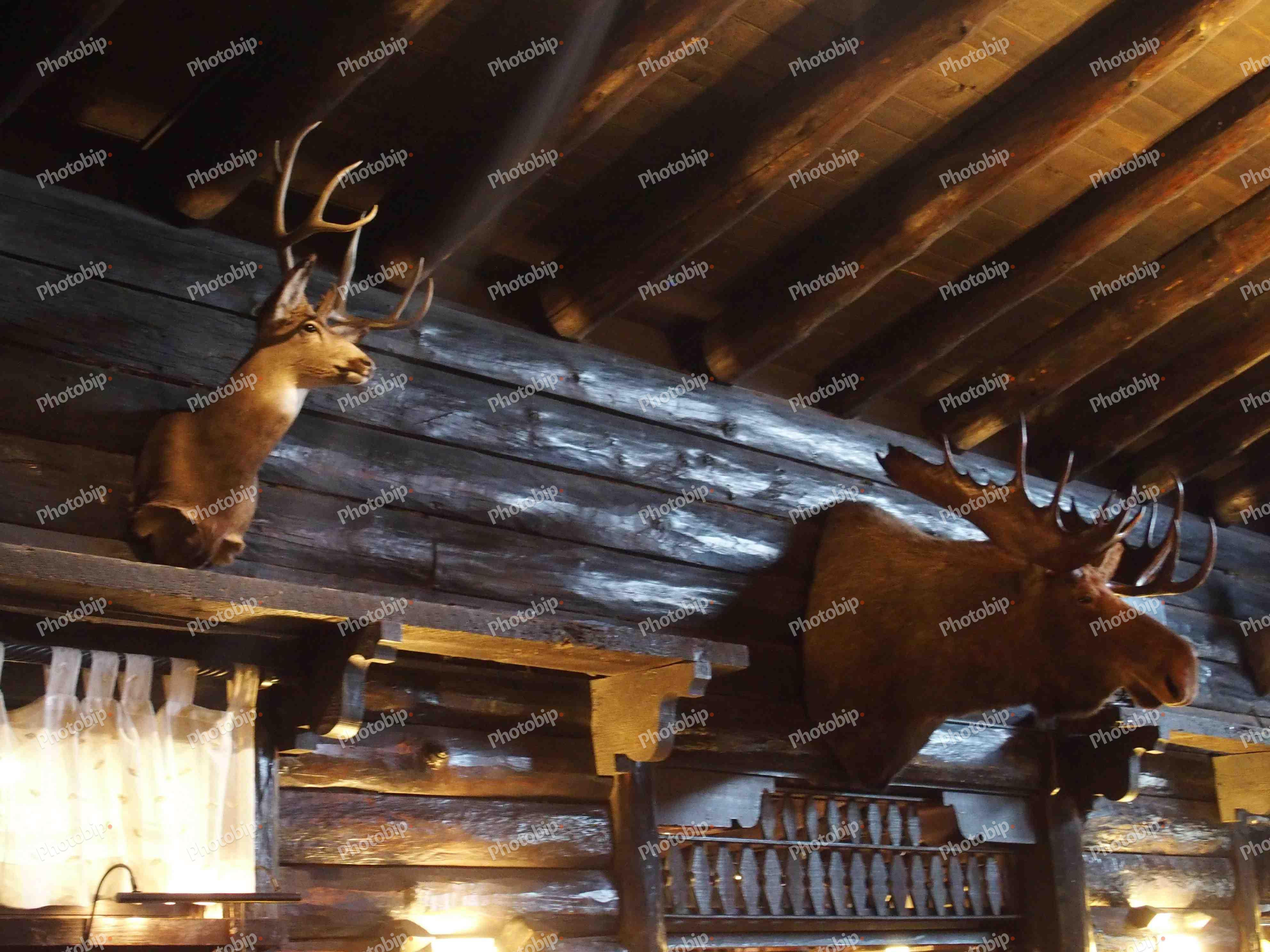 Preparirane glave jelena i losa na zidu kolibe
