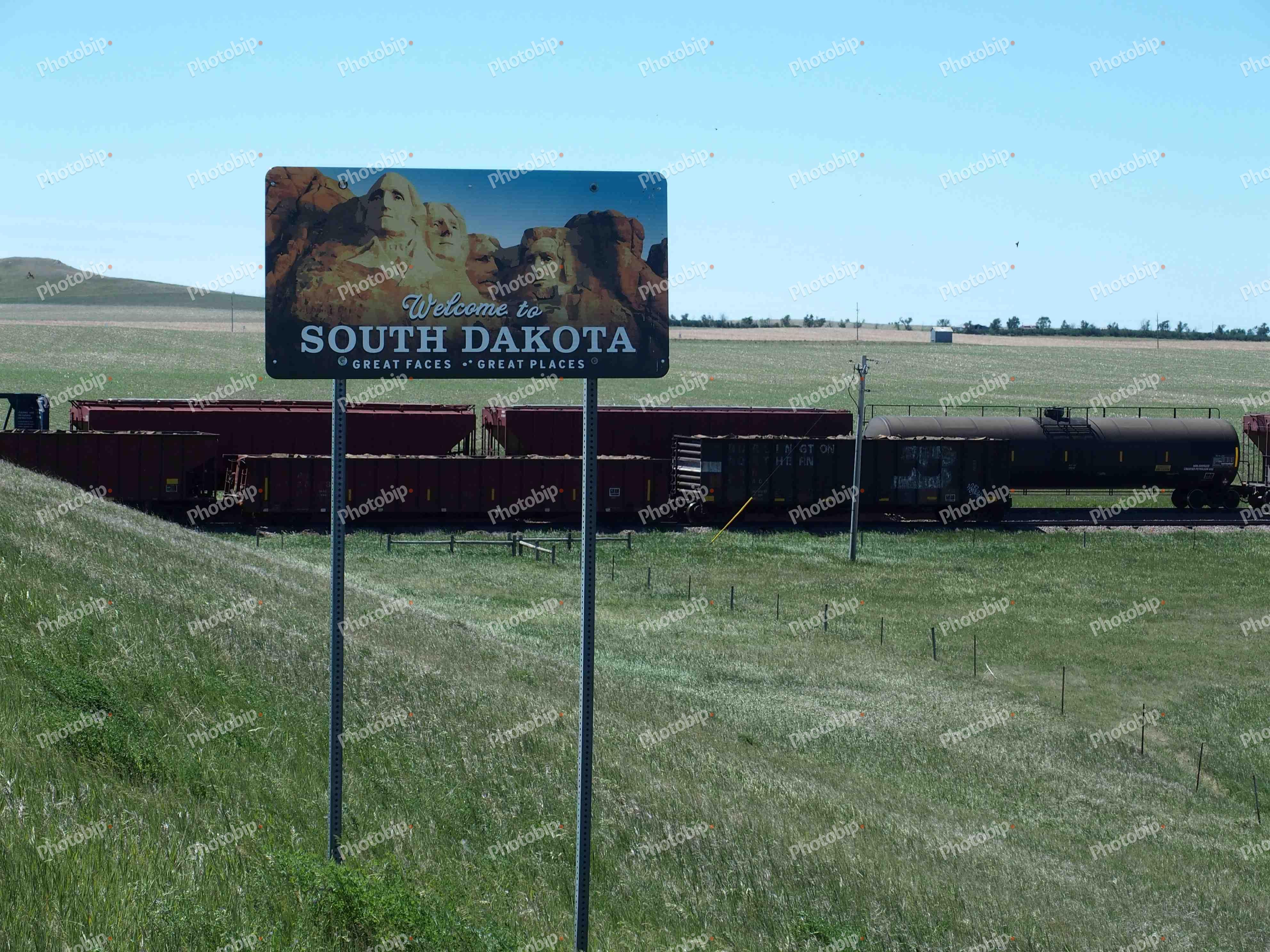 Znak dobrodošlice u Južnu Dakotu ispred teretnih vagona