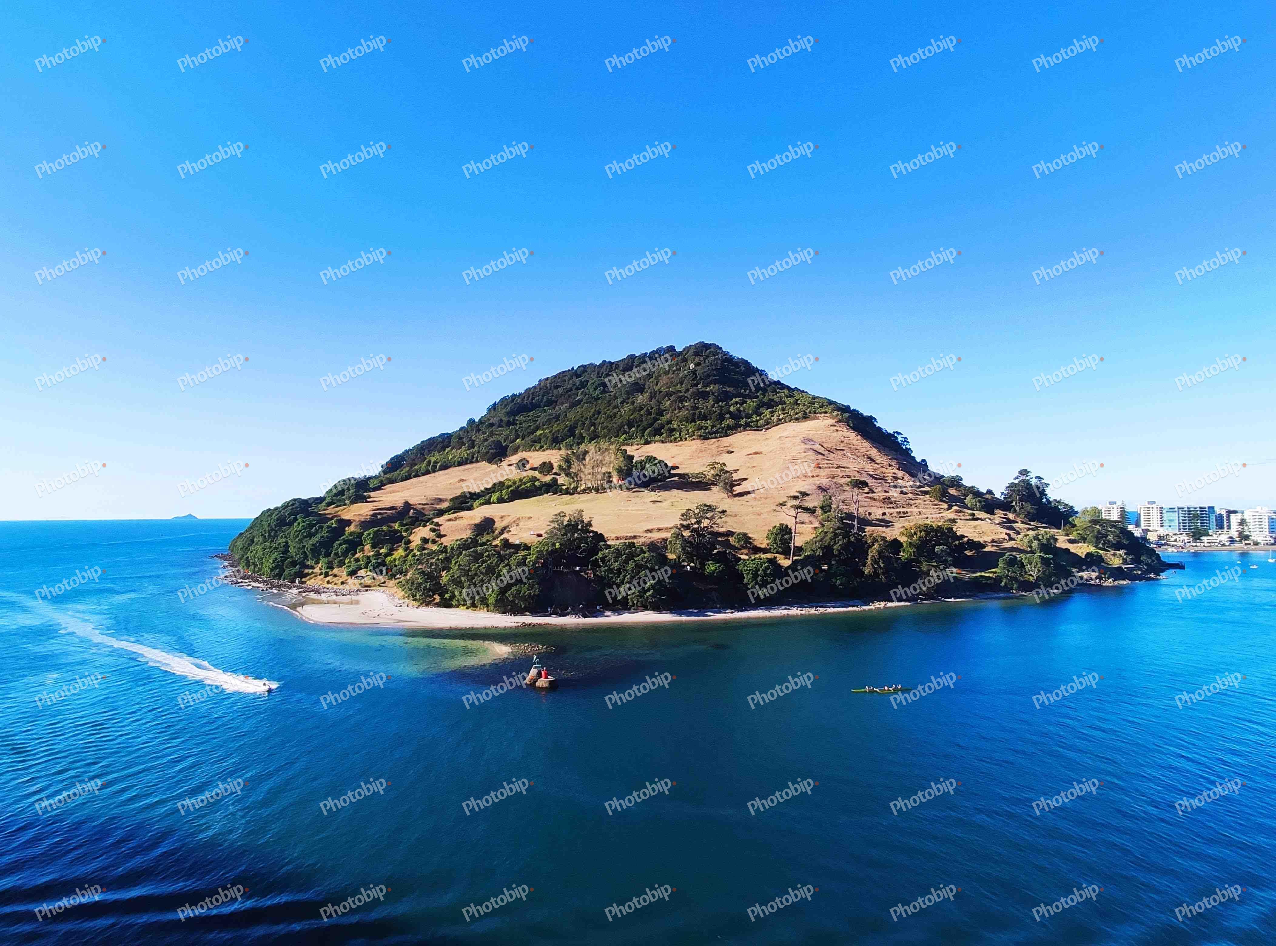 Plovila plove pokraj otoka i grad u pozadini.