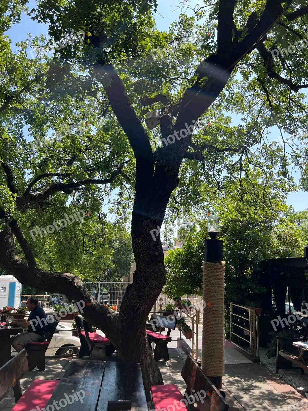 Pogled na veliko stablo usred terase restorana.