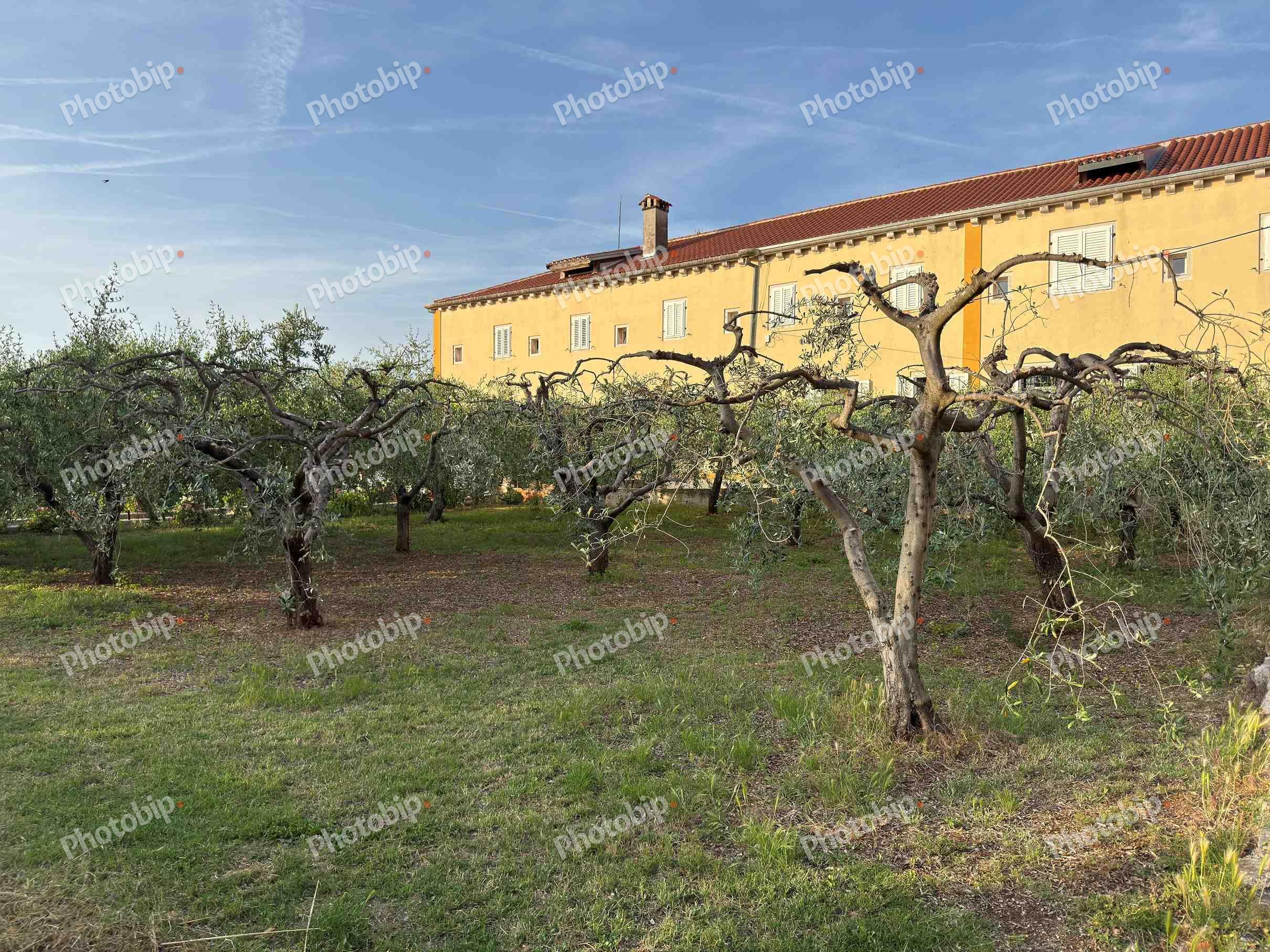 Maslinik i žuta zgrada u pozadini.
