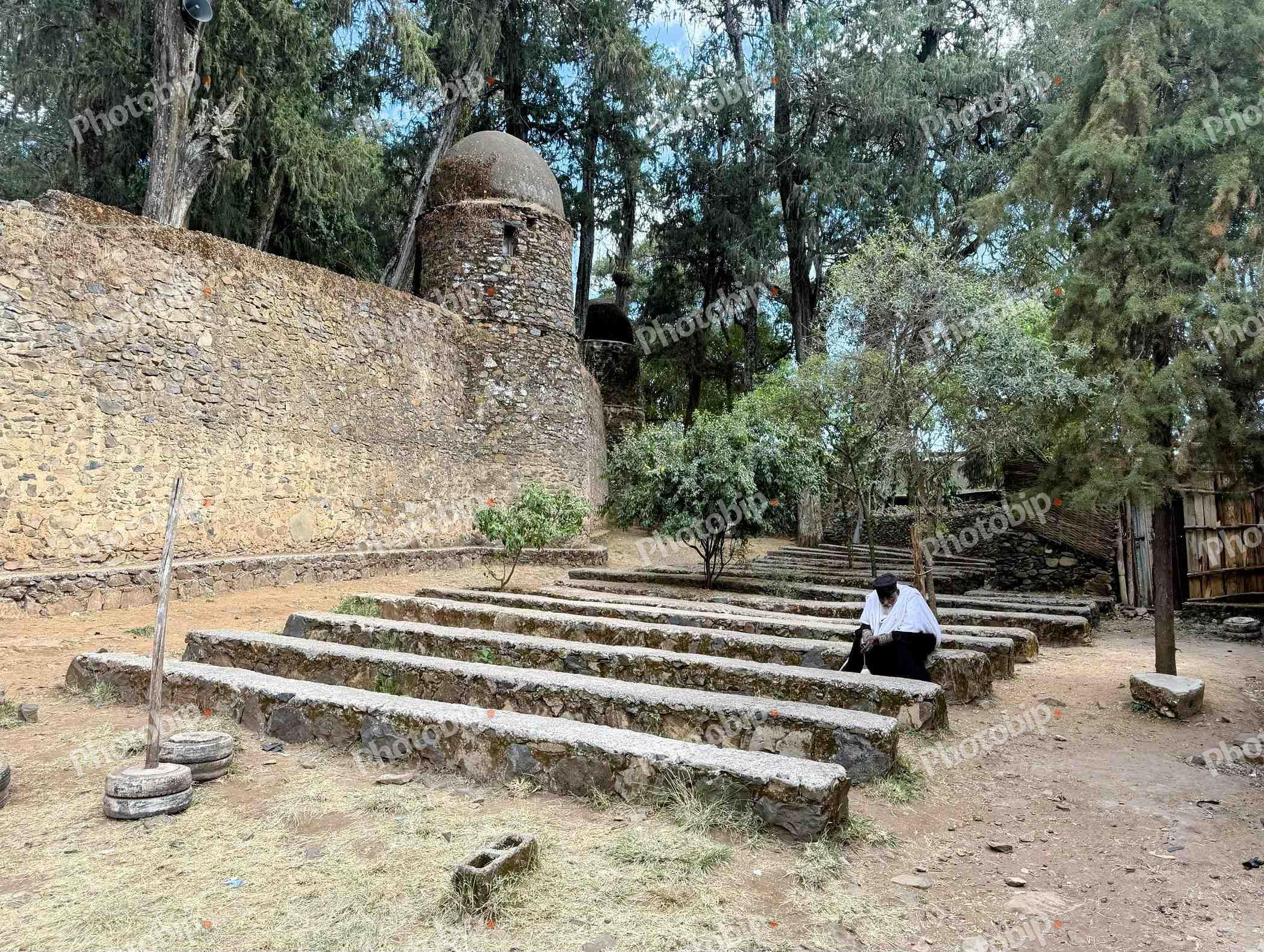 Svećenik sjedi na kamenoj klupi