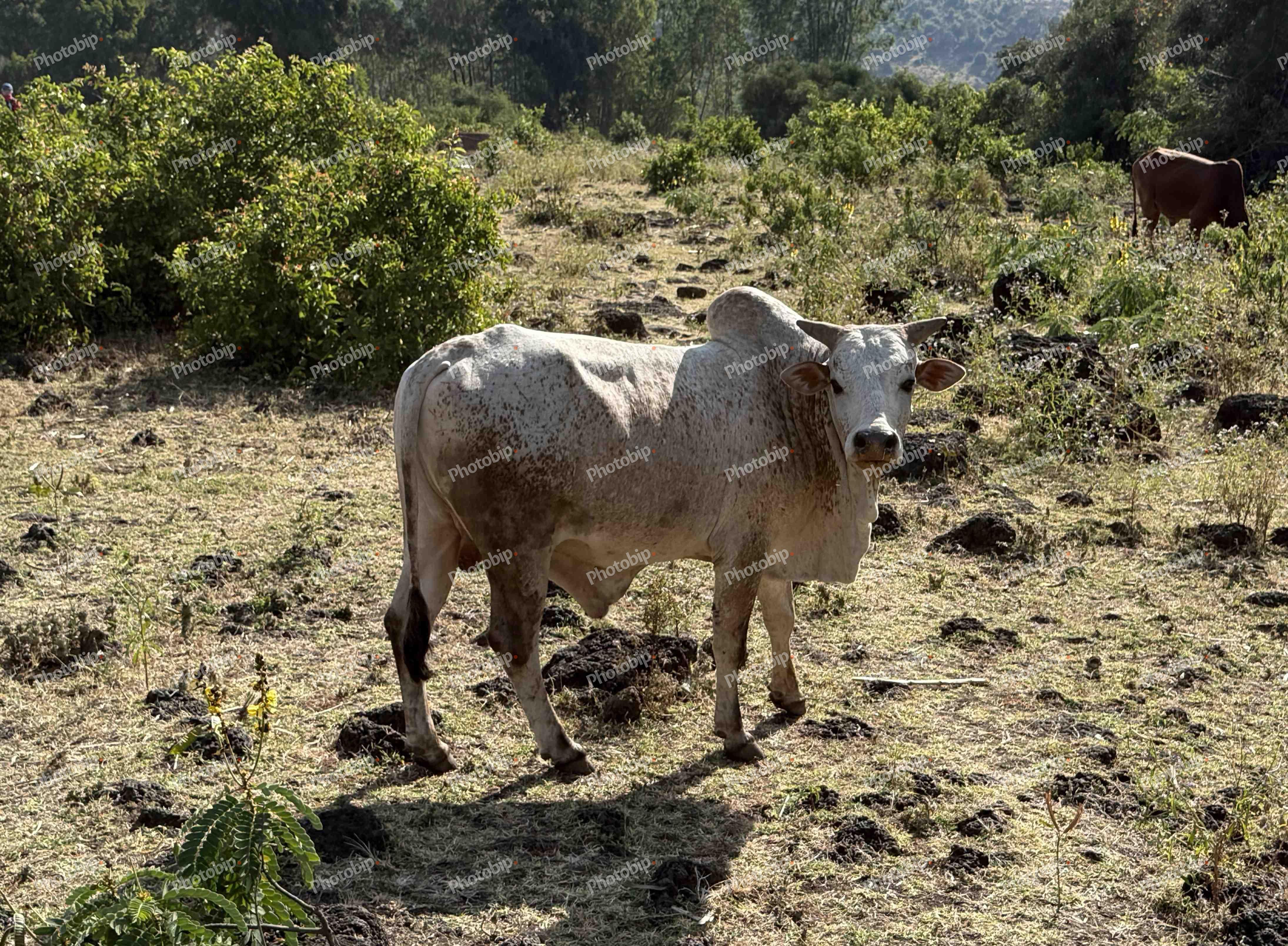Krupni plan bijelog Nelore ili Gyr bika koji mirno stoji na suhom pašnjaku, s manjim rogovima i karakterističnom grbom, okrenut prema kameri. U pozadini se vide zeleno grmlje, suha trava i kamenje pod