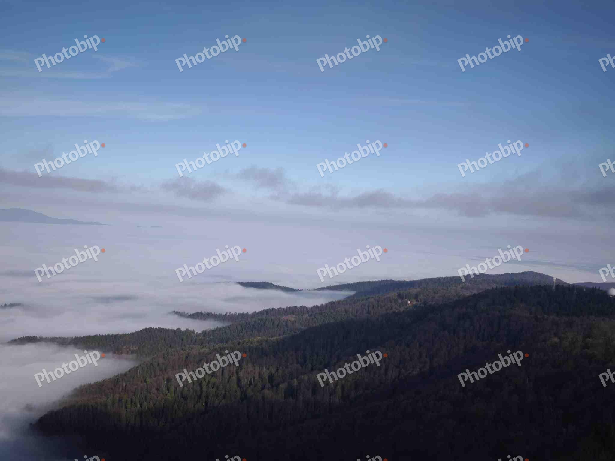 Slika prikazuje prekrasan planinski pejzaž s gustim, tamnim šumama na obroncima brda koja izviruju iznad mora oblaka. Nebo iznad oblaka je vedro, plavo, s tek pokojim raspršenim oblačkom.